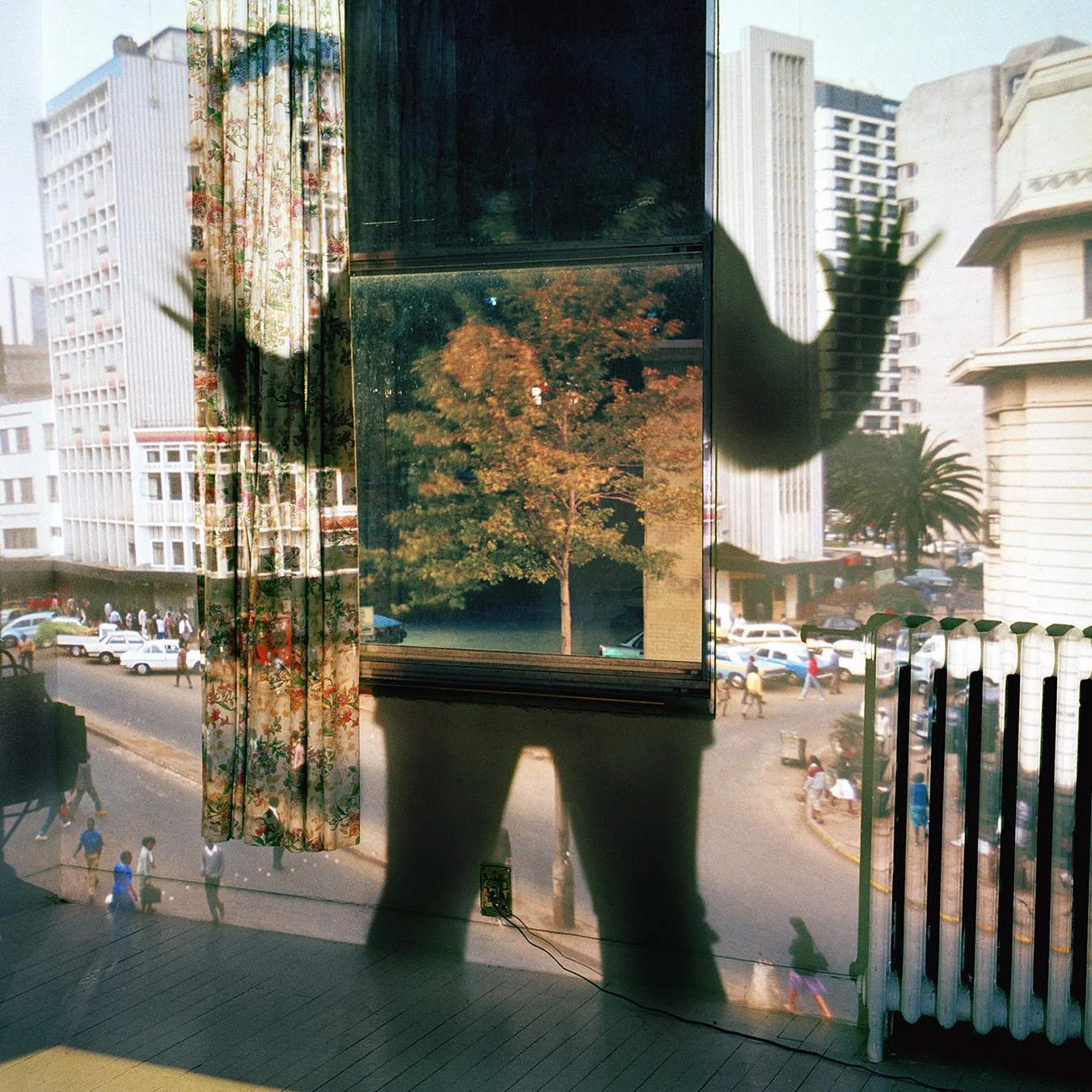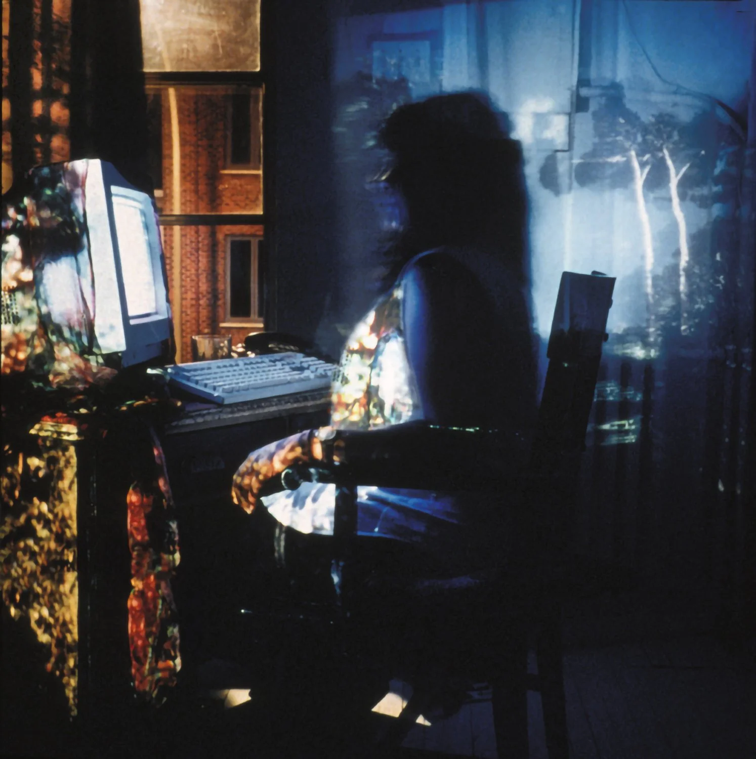 At the gallery entrance of the gallery, a glass pane from an old wooden door encases a photo transparency of myself sitting at my computer with a projected jungle scene from Central Africa surrounding me. This piece gave a glimpse into the world I created for the main gallery space. Inside the gallery large Sona tubes act as pillars positioned underneath skylights which house large photo transparencies which are illuminated by the sun. A circular sculptural piece is filled with white sand, that reveals a water image when one interacts with the sand by letting it filter through your fingers. The final component is a projection unto white sand on the floor that shows image of myself twisting and turning. A four-track sound component accompanies this piece.