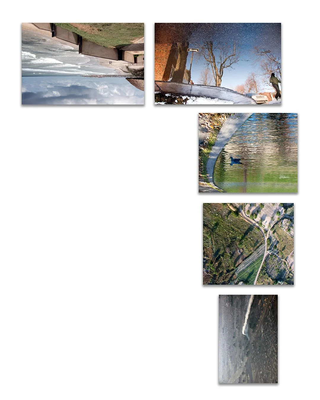 A series of drawings of tornadoes was the visual starting point for this project. I originally envisioned tornadoes in cubes – boxed, packaged and harnessed into control. However, the world is round allowing no edges where one may hide, so I shifted to spheres and fishbowls. Following this I began to photograph reflections from ponds, windows, puddles, and so on, which I oriented upside-down making them right way up – thus defying gravity, leaving space and time, in a sense, hanging in mid-air. In other instances, I merely flipped images to render an alternative meaning.