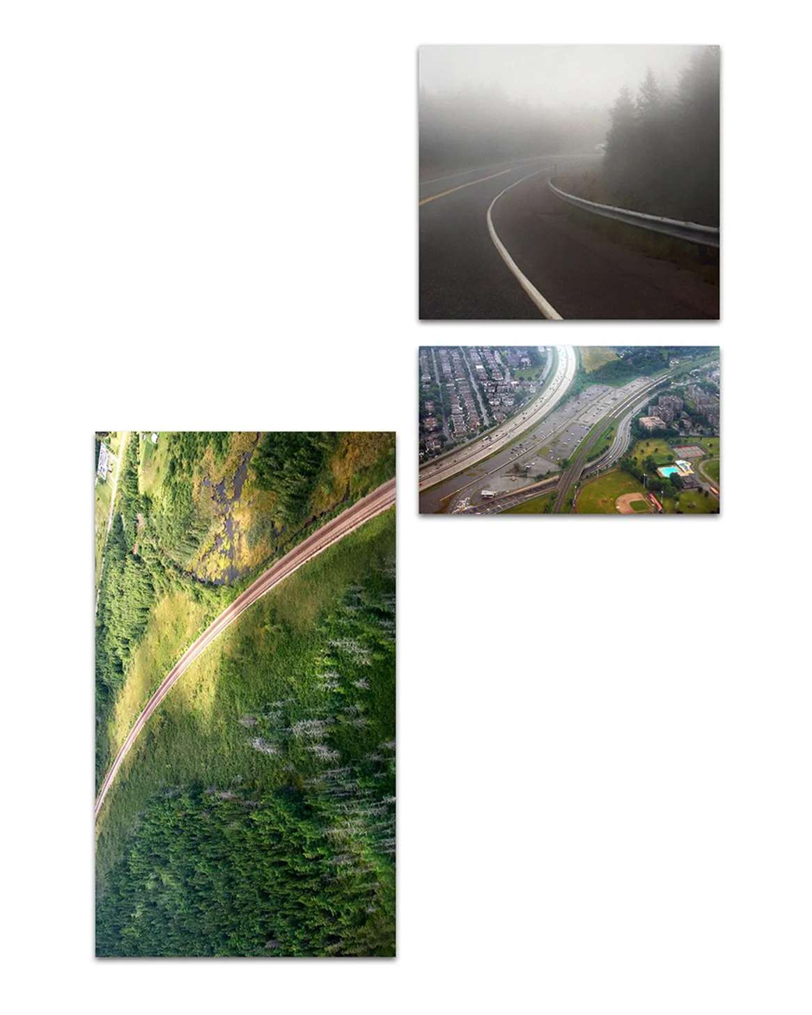 In other works, a cluster of photographs, criss-crossed lines of highway overpasses in Vancouver, roadside stalls in Ghana, the upside-down image of a palm tree-lined median strip in Mexico, autumnal leaves reflected in a lake in Parc La Fontaine, Montreal, various aerial views of landscapes in Mexico, Turkey and Argentina, describing the surfaces of places. Collapses space and reorients images into a gestural line reminiscent of swirls from a tornado.
