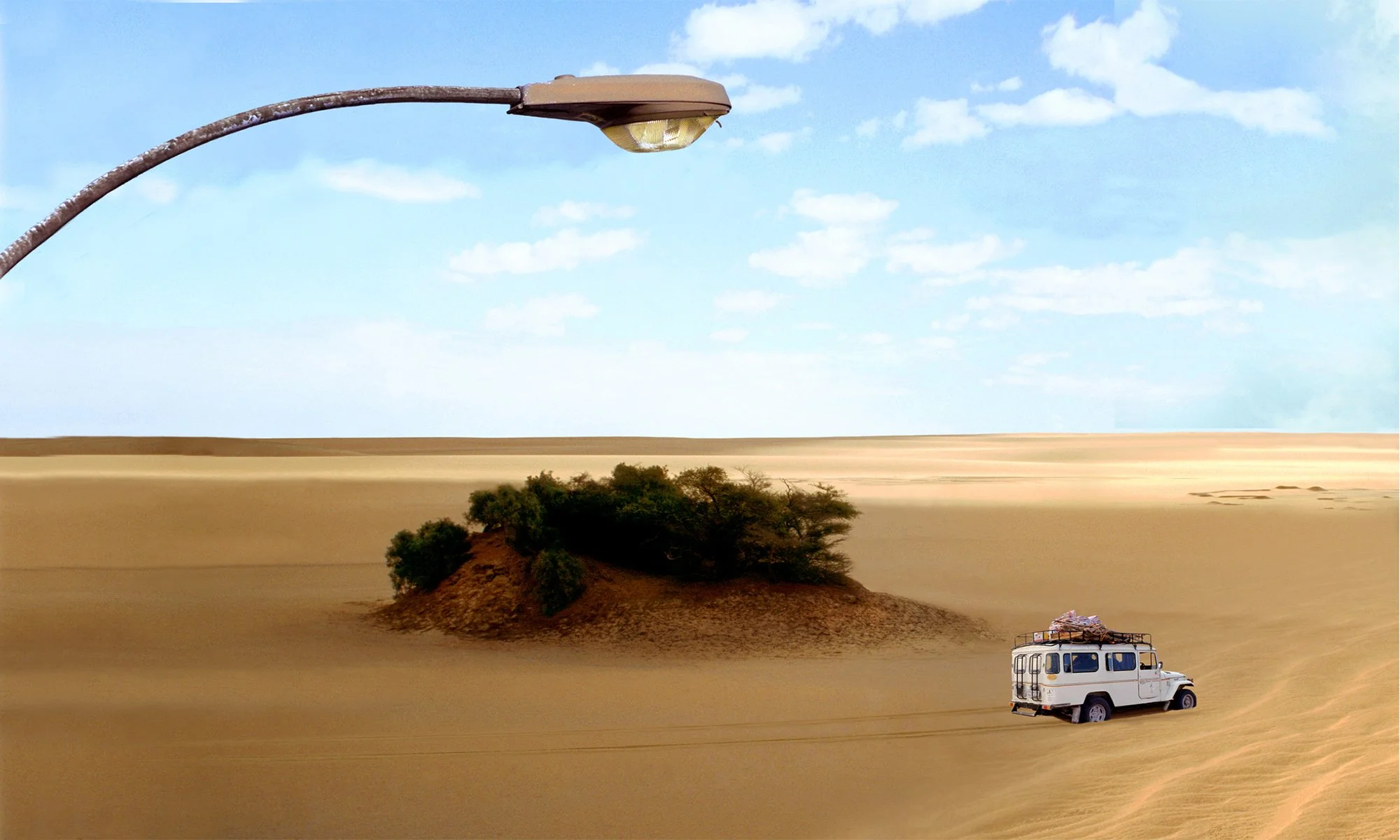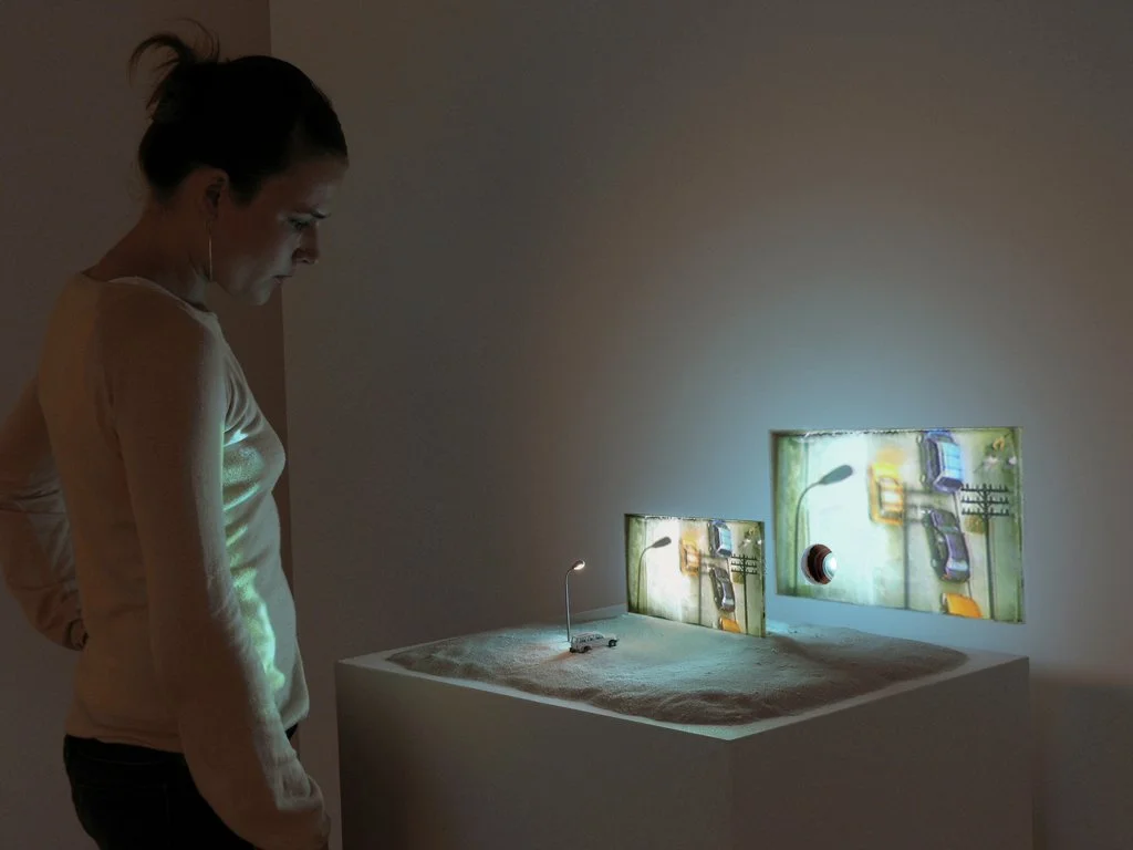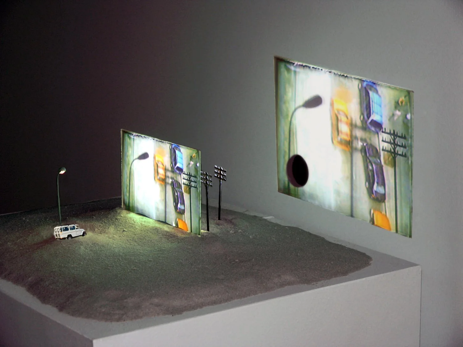 Maquette for a Filmic Moment replicates a scene from the large White Desert collage into a small installation piece, providing a more ‘intimate epic.’ Ingredients: sand, miniature jeep, lampposts, outdoor movie projection screen, and video projector.