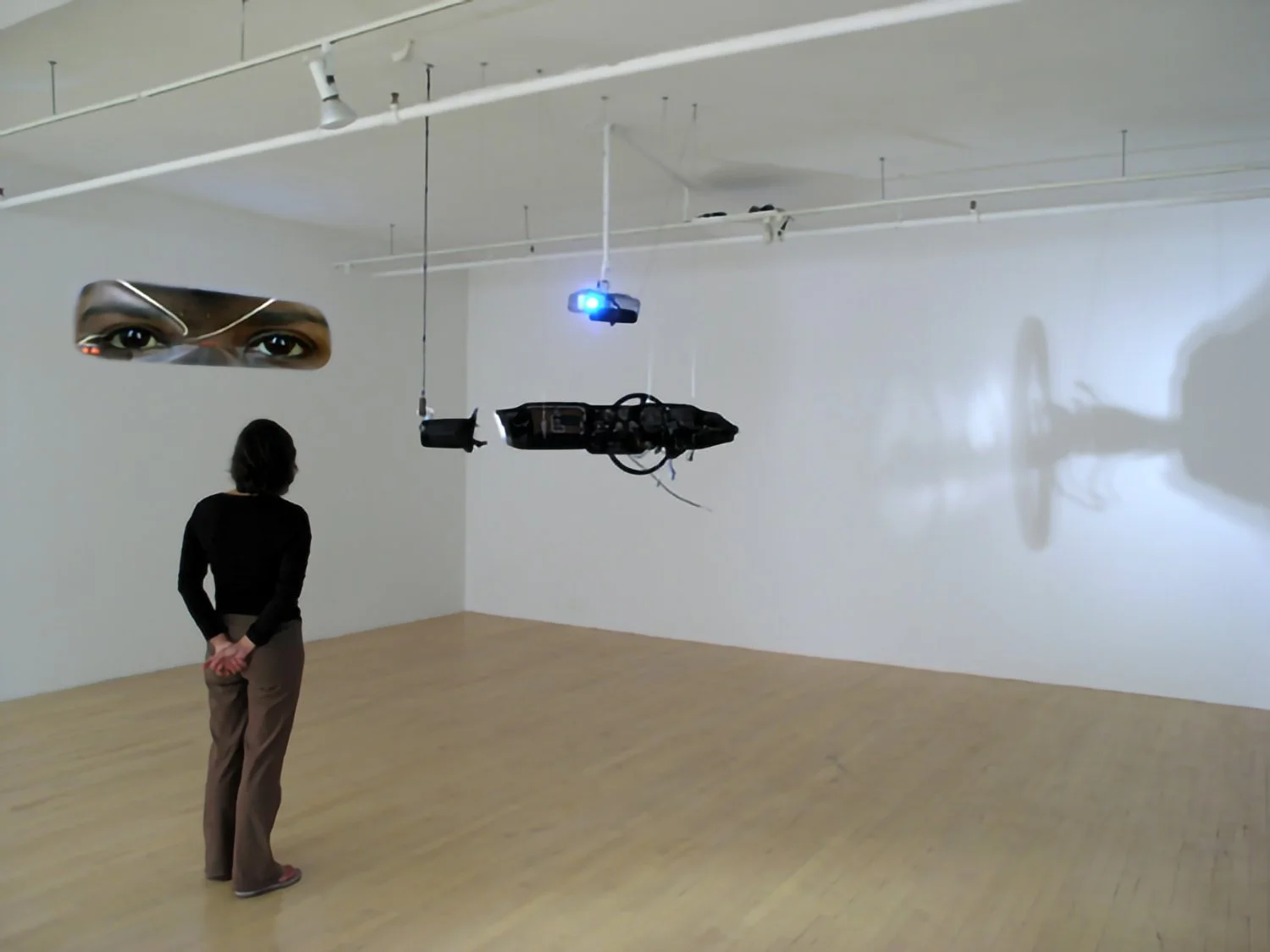 Triumph: Reversing Forward uses the wooden dashboard of the Triumph TR6 (sports car), as an automated flaneur. A video projection of roads moving forward through my eyes, is from a rearview mirror–hanging above the dashboard. Ingredients: Triumph TR6 dashboard, rearview mirror, wires and video projector.