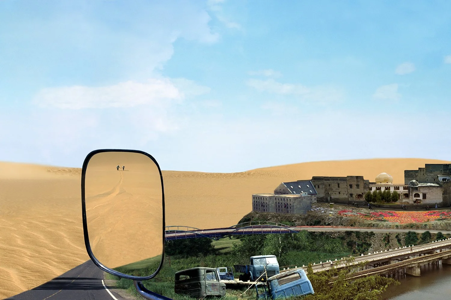The White Desert collage is a delirium of moments caught and reassembled into a large panoramic photo-collage that reads like a film strip. Reading left to right, the work begins in Cairo and weaves itself through the White Desert in Egypt, crosses the Sahara Desert and arrives in downtown Montreal. In one segment a lamp post outside my house (in Canada) becomes the light that hovers like an alien spaceship while the white jeep symbolizes the “safe house for travel and tourism, and perhaps even “home” (a word, for me, that carries more unbearable weight and lightness than I care to admit). This collage enabled me to create new a geographical location, rooted in ‘real’ experience but remembered as a single imagined moment.