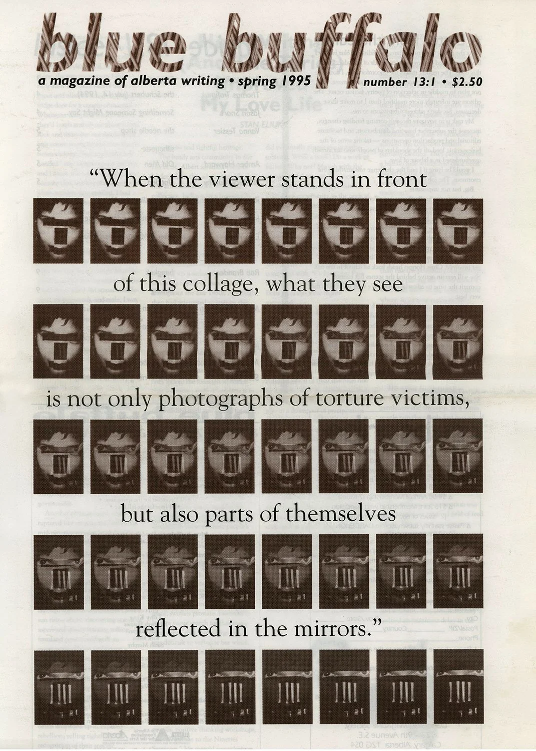 "When the viewer stands in front of this collage, what they see is not only photographs of torture victims, but also parts of themselves reflected in the mirrors."