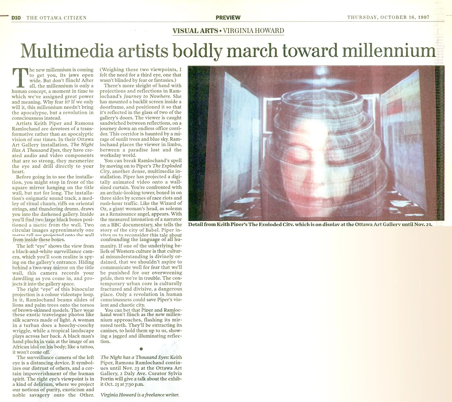 You can break Ramlochand's spell by moving on to Piper's The Exploded City, another dense, multimedia installation. Piper has projected a digitally animated video onto a wall-sized curtain. You're confronted with an archaic-looking tower, boxed in on three sides by scenes of race riots and rush-hour traffic. Like the Wizard of Oz, a giant woman's head, as solemn as a Renaissance angel, appears. With the measured intonation of a narrator on a BBC documentary, she tells the story of the city of Babel. Piper invites us to reconsider this tale about confounding the language of all hu-manity. If one of the underlying beliefs of Western culture is that cultural misunderstanding is divinely ordained, that we shouldn't aspire to communicate well for fear that we'll be punished for our overweening pride, then we're in trouble. The contemporary urban core is culturally fractured and divisive, a dangerous place. Only a revolution in human consciousness could save Piper's violent and chaotic city.