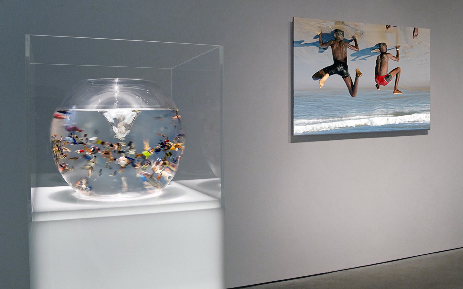 Fishbowl: hand painted HO scale miniatures, plexiglass base, magnetic stirrer, water, and lights. size variable.