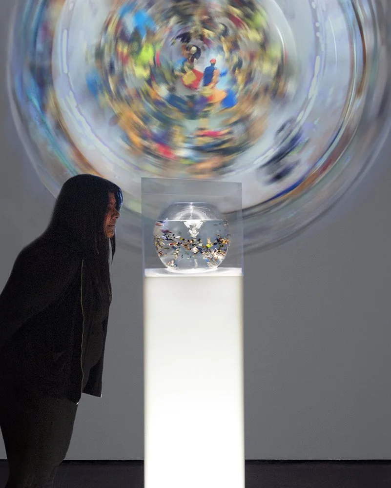 Turbulence consists of a small working tornado in a fishbowl with miniatures from the everyday (people, animals, cars, bicycles, fire hydrants, etc.) This piece is seen from two perspectives; one as a small sculptural glass work, hypnotically rendering a tornado in a perpetual state of forming, while a magnet twists and twirls miniature particles into a sort of “chaotic order”. The second viewpoint is a large circular projection, from a video camera recording the movement of the twister from above. This renders the tornado as a roulette wheel – a game of chance as a metaphor for life.